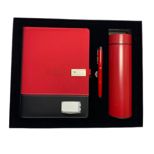 COFFRET BLOC NOTE + GOURDE THERMOS + PORTE CLE +STYLO DE LUX ROUGE