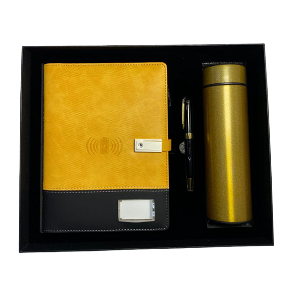 COFFRET BLOC NOTE + GOURDE THERMOS + PORTE CLE +STYLO DE LUX jaune
