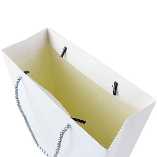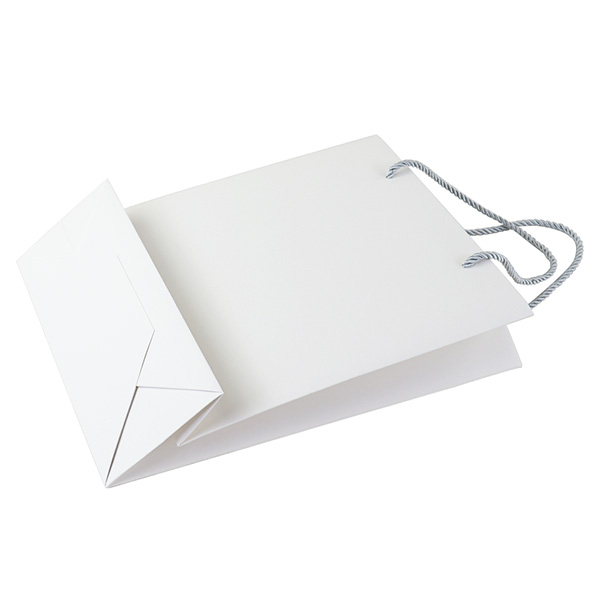 Ce sac de shopping de luxe est présenté dans un format vertical classique (31 cm x 38 cm), idéal pour les achats de taille moyenne à grande. Son design se distingue par sa couleur blanche éclatante avec une finition brillante (glossy), conférant une allure très propre, moderne et lumineuse. Il est équipé de poignées en corde tressée claire qui complètent son esthétique soignée et assurent un transport confortable. La surface blanche brillante offre un excellent support pour la personnalisation où les logos peuvent être imprimés en couleur (noir, or, ou couleur vive) pour un contraste élevé. Il est principalement utilisé par les marques de mode contemporaine, les boutiques de mariage ou pour tout événement où l'on souhaite véhiculer une image de pureté, de fraîcheur et de sophistication.
